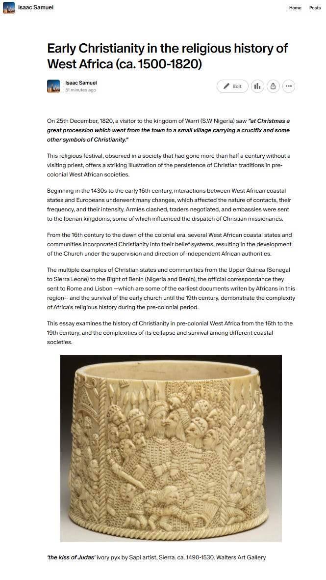 The history of Christianity in pre-colonial West Africa is the subject of my latest Patreon Article. Please subscribe to read about it here: