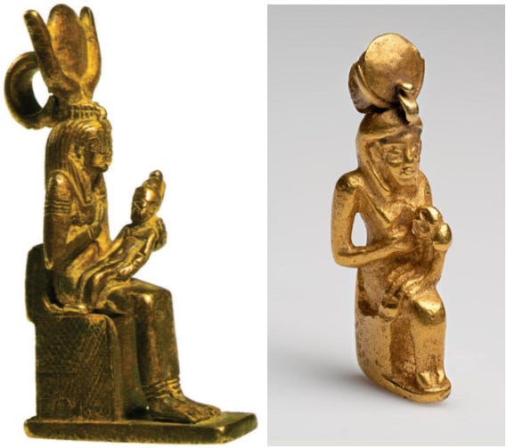 Amulet showing seated Isis suckling her son Horus. Nubian, Napatan period, 25th Dynasty, 7th century BC. Findspot: Meroe, Sudan. Amulet of Isis nursing the infant Horus, Nubian, Meroitic Period. Findspot: Sudan, Meroe. Boston Museum.