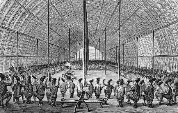 King Munza of the Mangbetu kingdom (in North-eastern D.R.C) dancing before his wives and courtiers in the royal hall.
