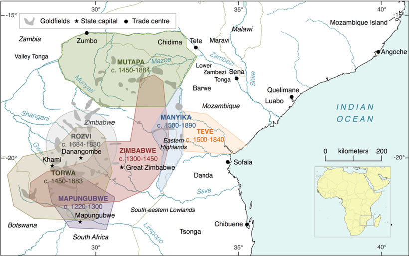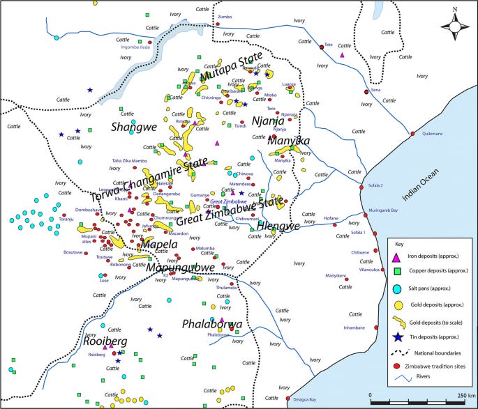 The approximate distribution of sources of ore and other resources within the territory of the Great Zimbabwe state. Map by Shadreck Chirikure.