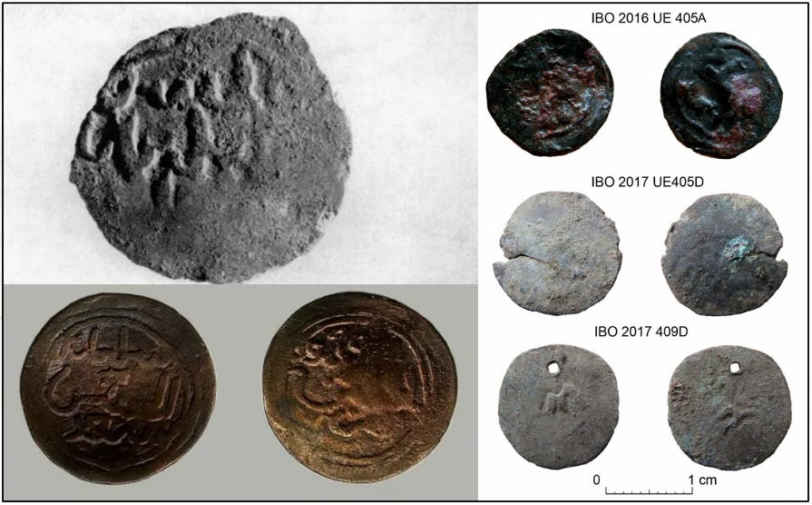 (top left) 14th-century copper coin from found at Great Zimbabwe, image by T. Huffman. (bottom) copper coins from Kilwa at the Tanzania museum. (right) 11th/12th-century Coins found at Ibo, Mozambique.