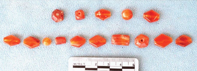Copper coins and carnelian beads from Songo Mnara, Tanzania. Image by J. Perkins et al.