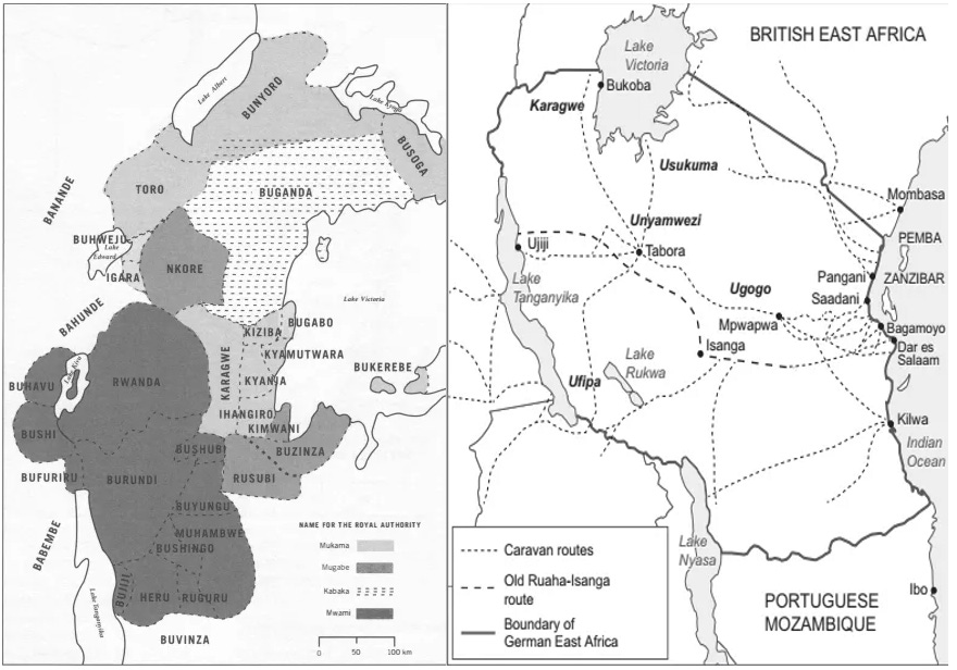 Map of late 19th-century East Africa showing the kingdoms of the Great Lakes and the caravan routes.
