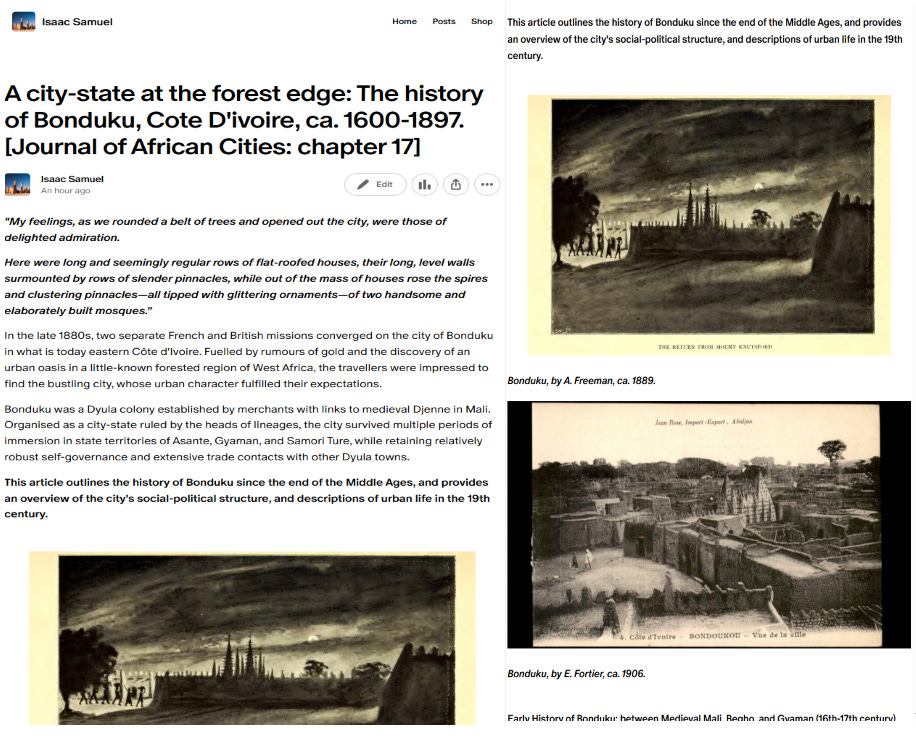 The city of Bonduku became a major hub whose distinctive cultural tradition and architecture presented a stark contrast to its rural hinterland. The history of Bonduku is the subject of my latest Patreon article