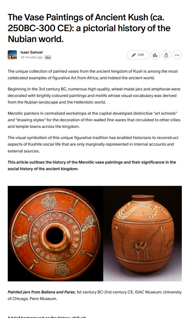 The vase paintings of ancient Kush are the subject of my Latest Patreon article. Please subscribe to read more about it here: