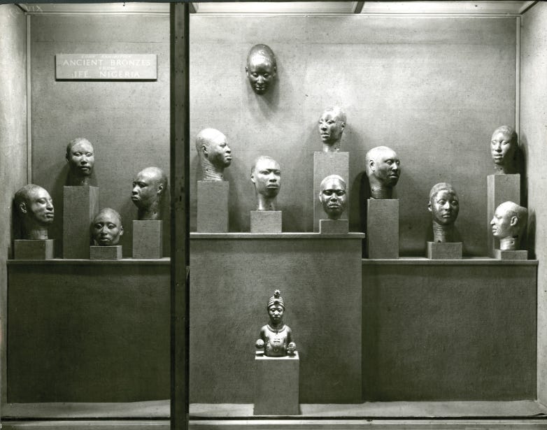 Twelve heads from Ife’s Wúnmọníjẹ̀ Compound on display at an exhibition held at the British Museum in 1947–48. Image by T. L. Evans