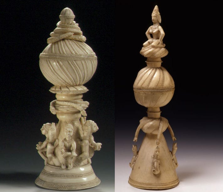 (left) Ivory salt-cellar with lid, decorated with snakes, dogs, and 4 human figures. Sapi artist. Sierra Leone. 15th-16th century. Staatlichen Museen zu Berlin (right) Ivory salt-cellar with lid decorated with a seated female figure, featuring depictions of snakes and dogs. Sapi artist. Sierra Leone. 15th-16th century. Staatlichen Museen zu Berlin.