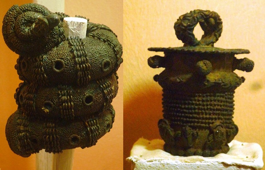 Bronze pot on a pedestal enclosed in a rope-work cage; Cylindrical Bronze bowl on an open-work pedestal decorated with alternating figures of grasshoppers, 9th century, NCMM Nigeria