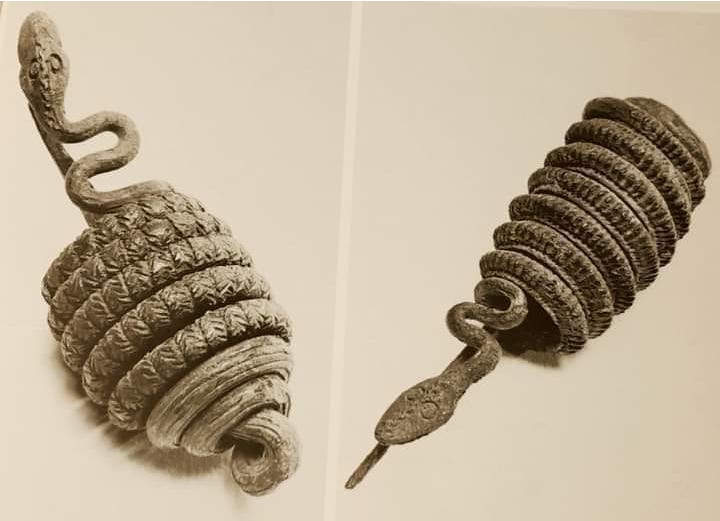Copper spiral snake ornament, 9th century, NCMM Nigeria, "the spike was probably driven into the end of a wooden staff