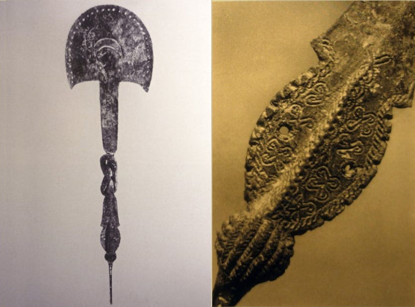 Another object indicating iconography of power was a remarkably preserved bronze hilt in the form of a horseman set on decorated pommel decorated in a grass-weave pattern surmounted by round bosses. The rider is depicted with exaggerated proportions relative to the horse, and with emphasis on the head in a style that would become ubiquitous for the region's art traditions especially in Ife and Benin. This is also one of the oldest equestrian figures in west Africa's forest region, where horses were mostly used for ceremonial display.25