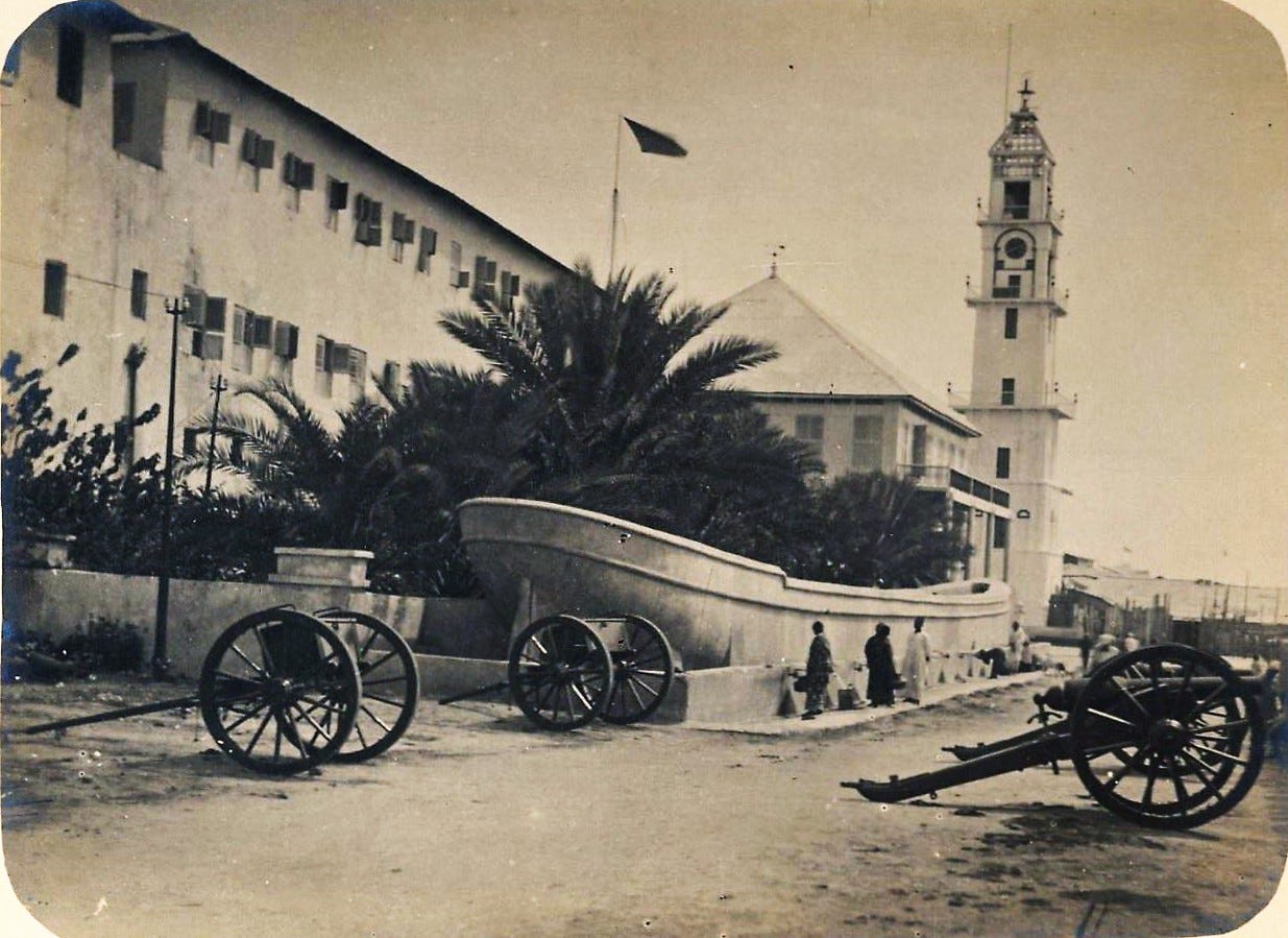 Zanzibar seafront, ca. 1890, showing the clock tower, the Sultan’s palace (center), a public water cistern in the shape of a ship’s hull, streetlights, and old cannons.