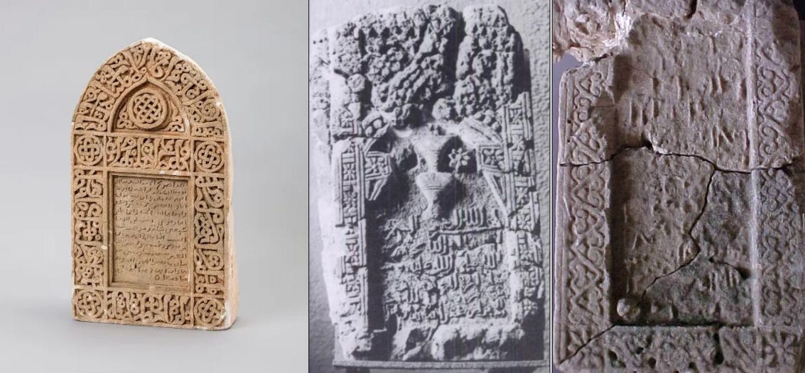 (left) 1462 epitaph of ‘Mwana wa Bwana binti mwidani’, from the Tuaca town in Mombasa, Kenya, Fort Jesus Museum. (right) Tombstone of an unnamed “free-born woman” from Kingany, Mozambique. Dated to the 14th-16th centuries. Image by Chantal Radimilahy