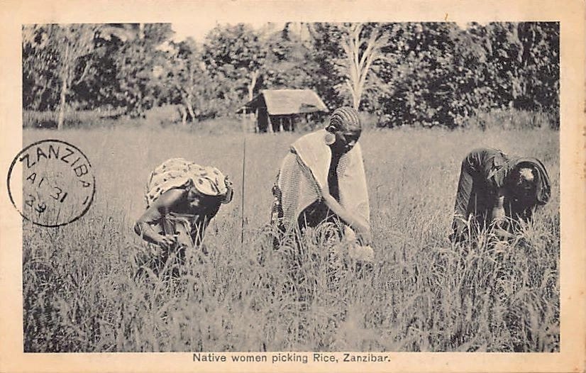 ‘Native Women picking rice.’ Zanzibar, Tanzania. early 20th century.