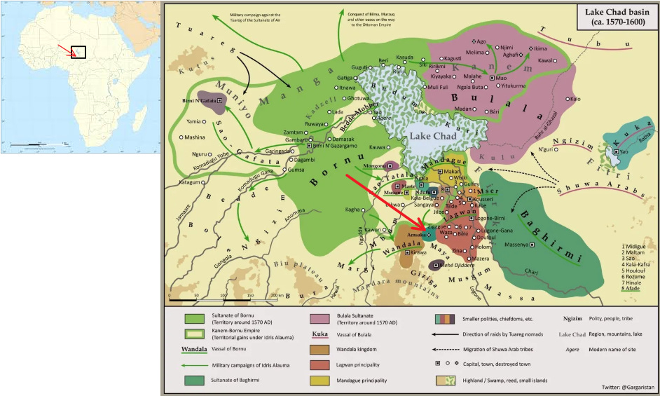 Amsaka, which today would lie along the Cameroon/Nigeria border, was the largest in the string of fortified settlements in the Lake Chad basin, which had long defied Bornu’s suzerainty.