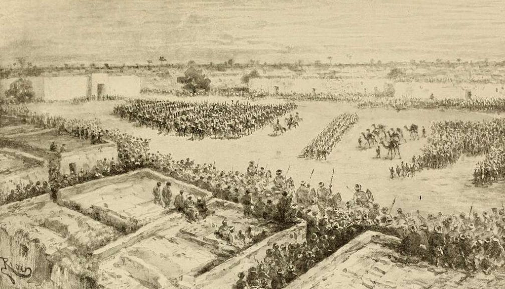 Reception of Monteil by Bornu’s courtiers, army, and spectators at Kukawa, Nigeria. ca. 1891. Monetil’s small party of less than a dozen was reportedly greeted by about 40,000 spectators, with a procession that led to the gate of the Sheikh’s palace (on the left), where his courtiers were waiting, while the Sheikh was observing the procession from an upper-story window. Monteil mentions that the Sheikh’s power had reduced considerably relative to that of his councilors, most notably, the Ghaladima, who “dealt with affairs not as a submissive vassal, but as an equal.”4