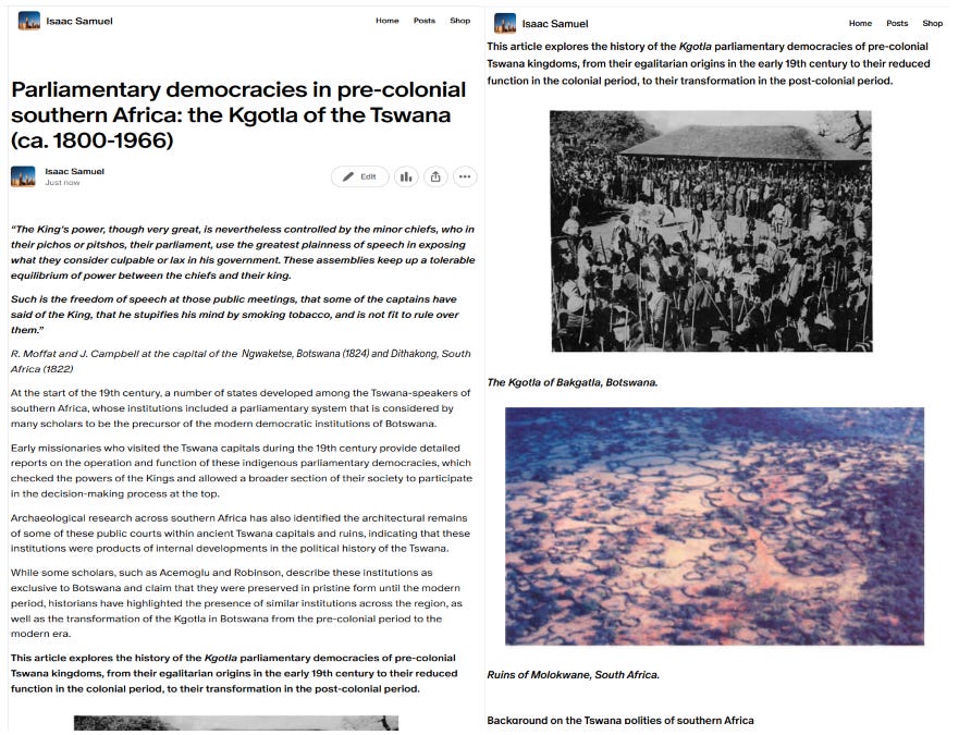 The parliamentary democracies of pre-colonial Tswana kingdoms and their evolution are the subject of my latest Patreon article. Please subscribe to read about it here, and support this newsletter: