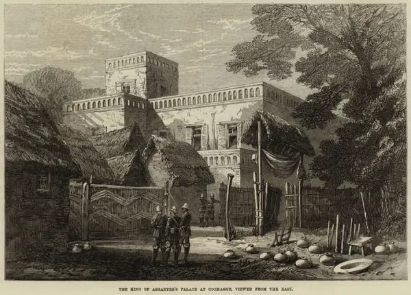 The ‘Aban’ stone palace of Kumasi, ca. 1874. image taken after the city’s capture by the British. According to the accounts of Bowdich and Dupuis, the palace was not used regularly as a royal residence, but had a semi-public function. The Asante king and his closest councilors at times met with foreign delegates in this structure and offered them a tour of their ‘museum’. [see my previous essay on Asante architecture ]