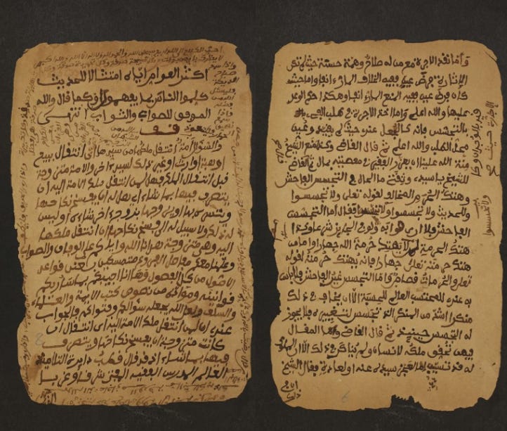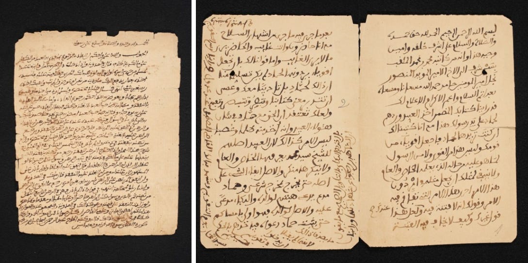 internal accounts on slavery in Africa. (left) Fatwá on the rulings of slaves in war. 19th century. Bibliothèque de Manuscrits al-Imam Essayouti, Timbuktu, Mali. (right) No. ELIT ESS 04014. Letter to the Emir of Hayre Ḥāmid ibn Aḥmad Lobbo regarding the ownership of certain slave lineages. 19th-20th century. Bibliothèque al-Cady al-Aqib, Timbuktu, Mali. No. ELIT AQB 01268. images from HMML Reading Room with the permission of SAVAMA-DCI.