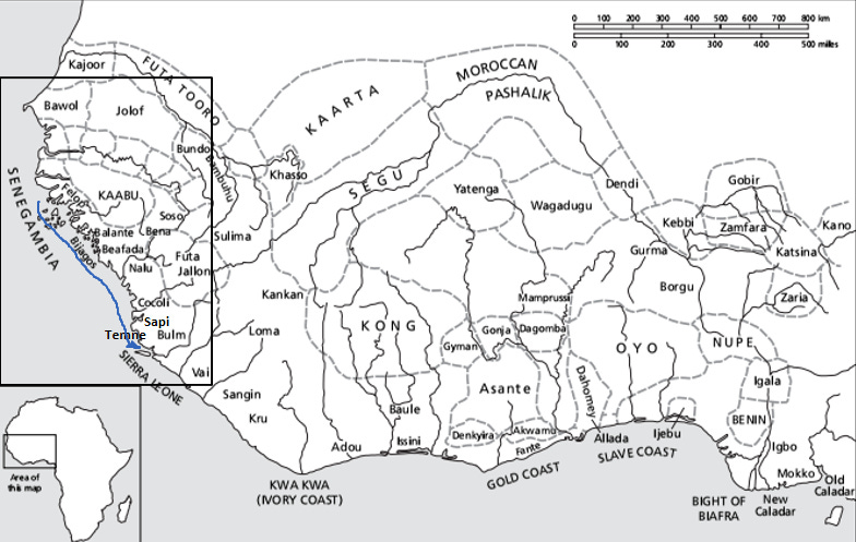 Map showing the Upper Guinea region. The blue outline marks the extent of the Biafada-Sapi network (shown as ‘Beafada’ on this map). For overland and riverine networks, see the map in the introduction.