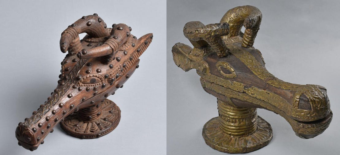 Carved wooden containers (orievbee) decorated with brass strips, used for the storage and presentation of kola nuts to guests. 19th-century Benin city, Nigeria.
