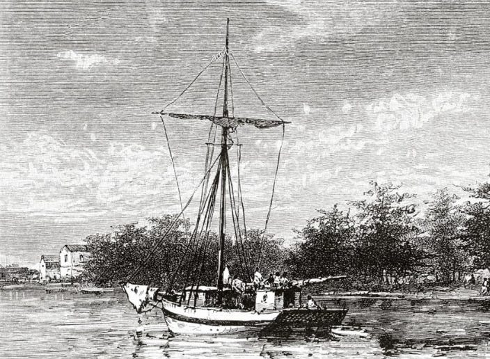 Sailboat near Goree, Senegal. 19th-century engraving.