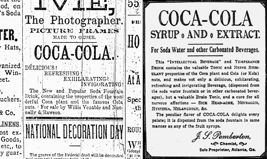 Some of the early advertisements for Coca-Cola. Atlanta Journal, May 29, 1886.