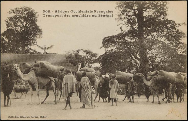 Camel caravan in Senegal. ca. 1906 Edmond Fortier. This specific caravan is transporting peanuts, which are another bulky commodity carried along the same trade routes.