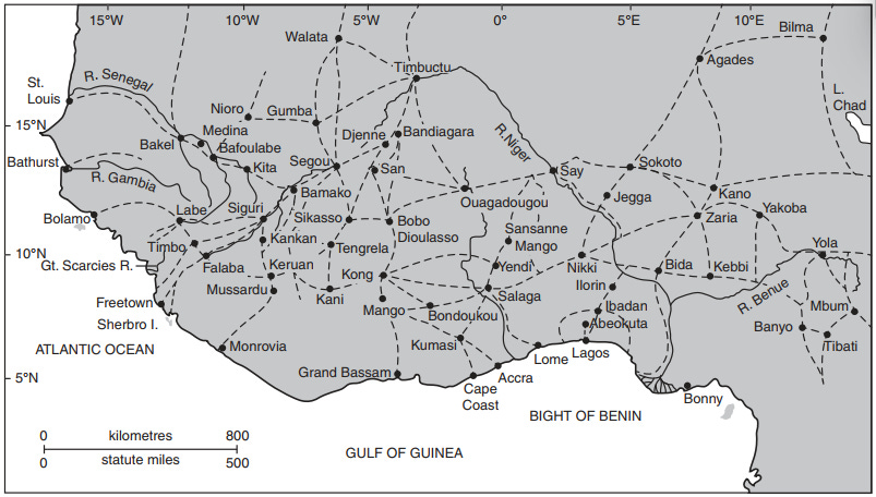 Long-distance trade routes in West Africa during the 19th century. Map by A. Hopkins.