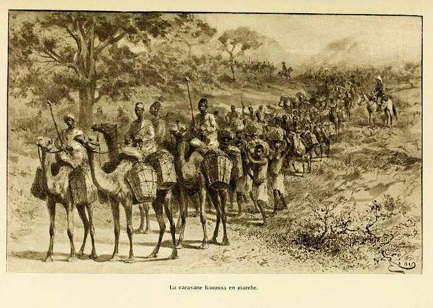 ‘Hausa caravan, in the lead a few camels carrying 4 loads of kola, then women heavily laden with kitchen utensils, behind the porters with a heavy load of kola’ engraving and caption by P L Monteil, 1892. Note that other accounts, especially by René Caillie, mention the participation of women as traders and not merely as companions of their male relatives.