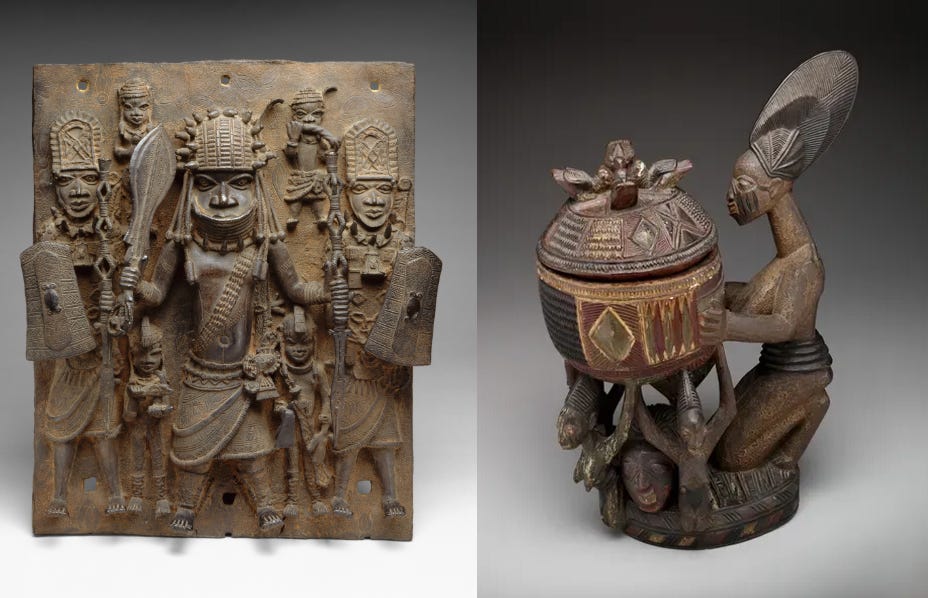 (left) 16th-century Brass plaque with Warrior and Attendants. Benin City, Nigeria. Met Museum. The small figure on the bottom left is carrying a Kola nut container. (right) Kneeling female figure with bowl (olumeye) for offering Kola. Olowe of Ise, Nigerian, (1875-1938). Dallas Museum of Art.