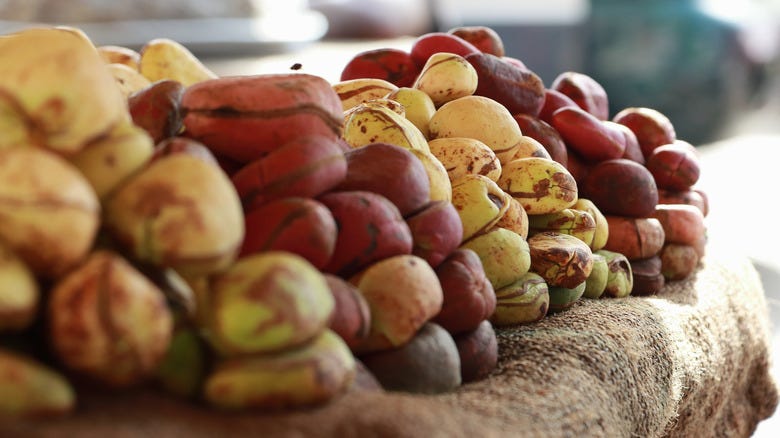 In the Asante region of modern Ghana, the gathering and processing of the nuts was mostly done on a small scale by family labour, including slaves and pawns, on lineage land. At harvest, the pods are soaked in water for several hours to weaken the shells. The nuts are then removed, dried, and stored in bundles lined with banana or cocoa-yam leaves. Storage is important, since aged nuts command a higher price. If the kola was not sold to a middleman, the head of the family transported it to the markets for sale.22