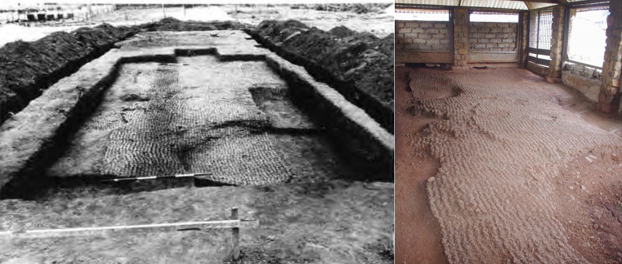 (left) Pavement at Ita Yemoo, Ife, measuring 9.4 x 3.7 m from the 1950s excavations. Image from Hunterian Museum and University of Glasgow Archives & Special Collections, Frank Willett collection.6 (Right) Pavement on the site of an ancient sacred place preserved in a space created within the grounds of the National Museum of Ile-Ife. image and caption by Gérard Chouin