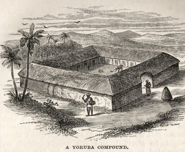 ‘A Yoruba Compound’, engraving by Anna Hinderer at Ibadan, ca. 1855