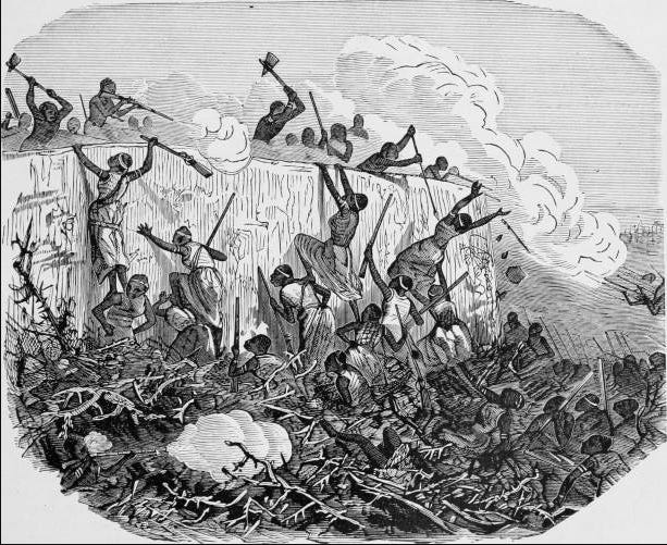 Illustration of the 1851 Battle of Abeokuta, during which Dahomey invaders attacked the Egbas’ capital of Abeokuta, in southwest Nigeria, the Egbas, occupying higher ground, use hatchets, spears, and British firearms to fend off Dahomey forces who climb the embankment. ca. 1877, GettyImages
