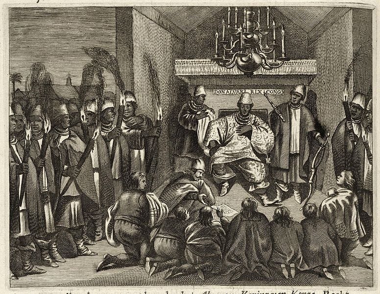 Dutch delegation at the court of the King of Kongo, 1641, in Olfert Dapper, Naukeurige beschrijvinge van den Afrikaensche gewesten (Amsterdam, 1668)