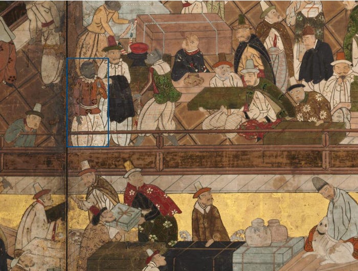 detail of a 17th-century Japanese painting, showing an African figure watching a group of Europeans, south-Asians and Africans unloading merchandise. Cleveland Museum
