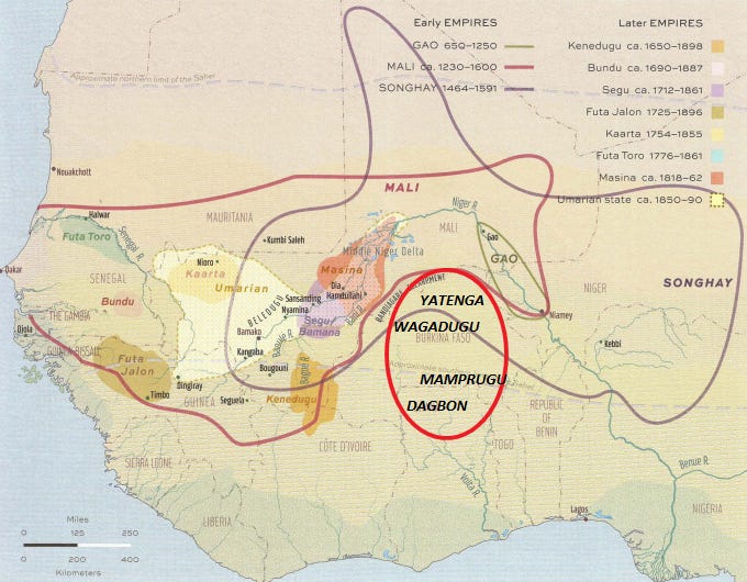 Map showing the Empires of the West African Savannah/Sahel and the Mossi states.