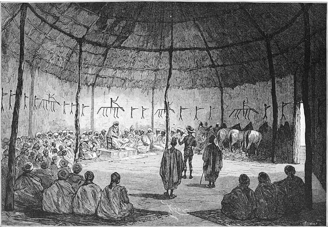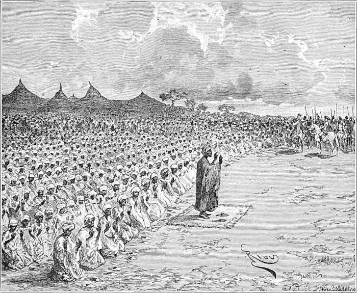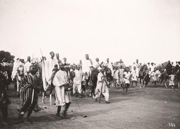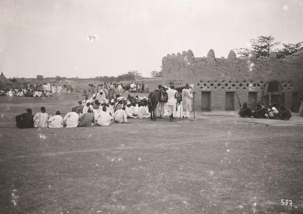 Prayer at Sakhaboutenga, a muslim town near Wagadugu. Image by L. Binger, ca. 1888: “The religious ceremony takes place in a plain to the east of the village; it is quite an impressive sight. A profound silence reigned in the assembly. The faithful, arranged in rows some twenty deep, prostrated themselves and rose with perfect unison and imposing slowness. From time to time, the imam’s voice rose, and in the deepest contemplation, an “amen” could be heard from the congregation. There were approximately three thousand people of both sexes present, almost all dressed in white. The burnouses, the chechias, and this collection of black faces gave the ceremony the grandiose character of oriental festivals.”