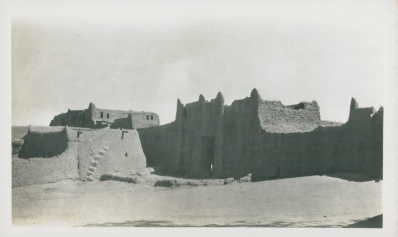 Burkina Faso, earthen houses. ca. 1930. This has been identified as a palace belonging to a royal Mossi family on the central plateau of Upper Volta.