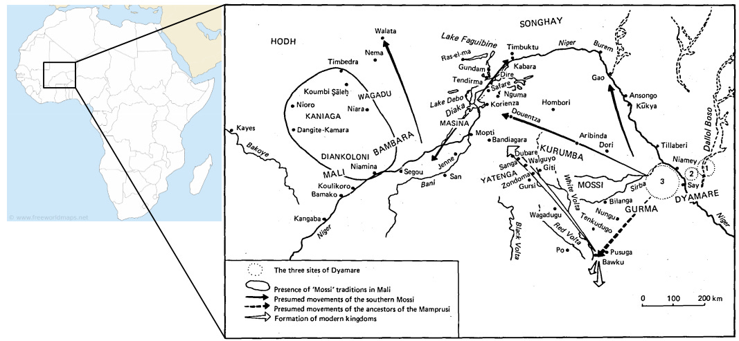 Most historians and translators of the Timbuktu chronicles argue that the two are the same group. Ivor Wilks, who belongs to this camp, includes a tradition from the southern Mossi kingdom of Dagbon that points to an eastern origin of a hunter-founder from the direction of Lake Chad to Zamfara and thence to ‘Malle’; a country west of Hausaland and east of Gurma.15
