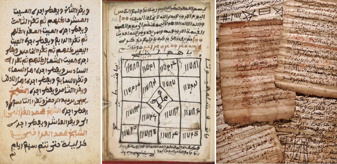 Various manuscripts from Asante, Ghana. (left) Instructions for reading the Kīmīyā-yi Sa’ādat (’the Alchemy of Happiness’) by Persian philosopher al-Ghazali. British Library. (center) number table and instructions on how to fill it. British Library. (right) talismanic manuscripts Musée d’ethnographie, Genève