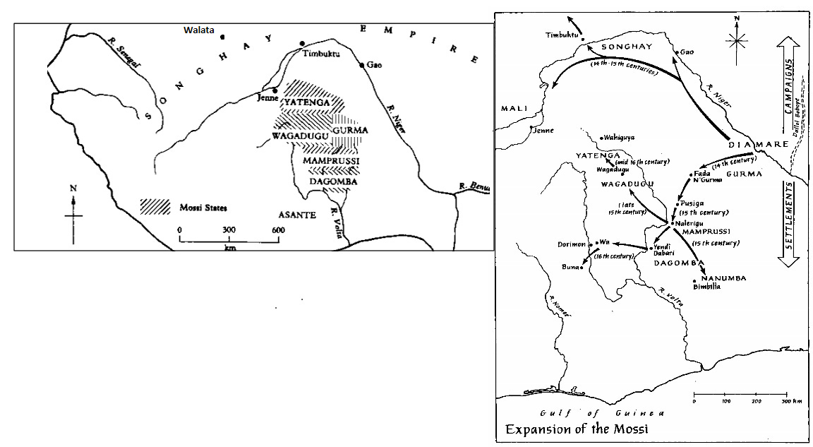 Michel Izard, on the other hand, argues that the two groups were not the same; based on a comparative analysis of the oral traditions of the northern and southern kingdoms that point to a common, southern origin, and the absence of references to conflicts with Songhai. He maintains that the proto-history of the modern Mossi, as far as it can be reconstructed, is a proto-history of Mamprugu in N.E Ghana, from where the other Mossi states emerged.17