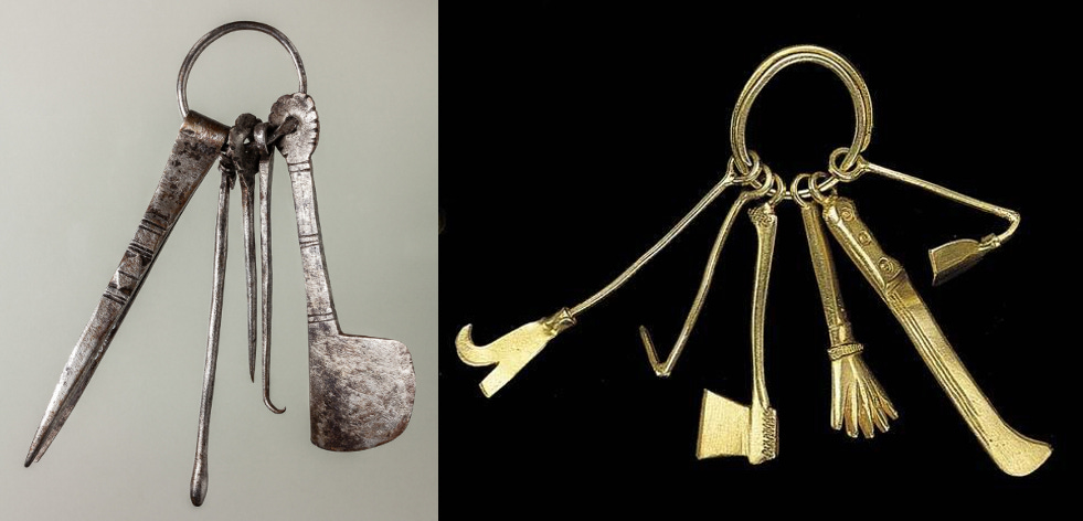 (left) grooming kit; tweezers, a kohl stick, a probe, a hooked probe, and a razor. Ballana, Lower Nubia, late Meroitic period. The Institute for the Study of Ancient Cultures, The University of Chicago. (Right) Gold necklace in the form of a grooming kit. Akan peoples, Ghana. 1895–1905. Houston Museum of Fine Arts.