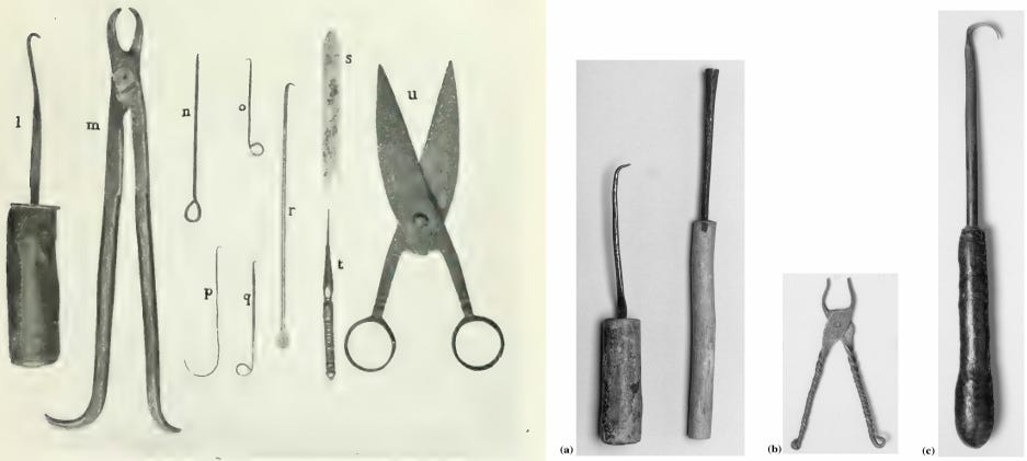 (Left) Dental and Ophthalmic instruments, for eye surgery, used by the Shawiya Berbers of Algeria. Images by Hilton-Simpson. (right) Medical instruments collected from Ankole (Uganda) by J Roscoe, and Hausaland (Nigeria). Image by Peter A.G.M. De Smet.