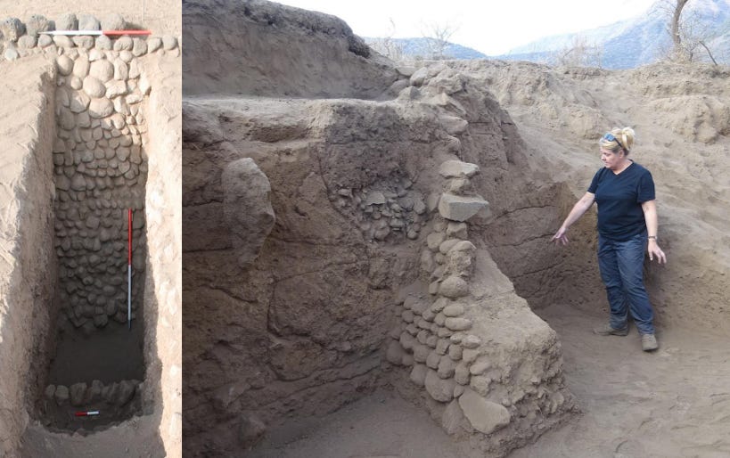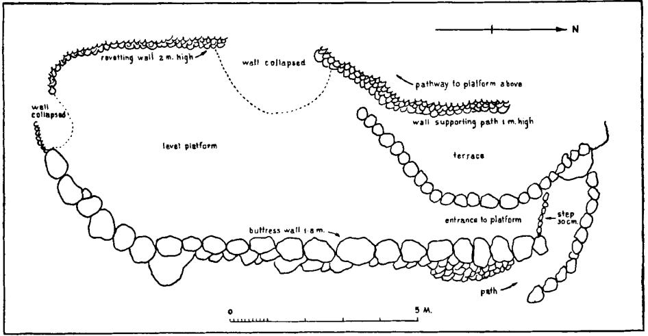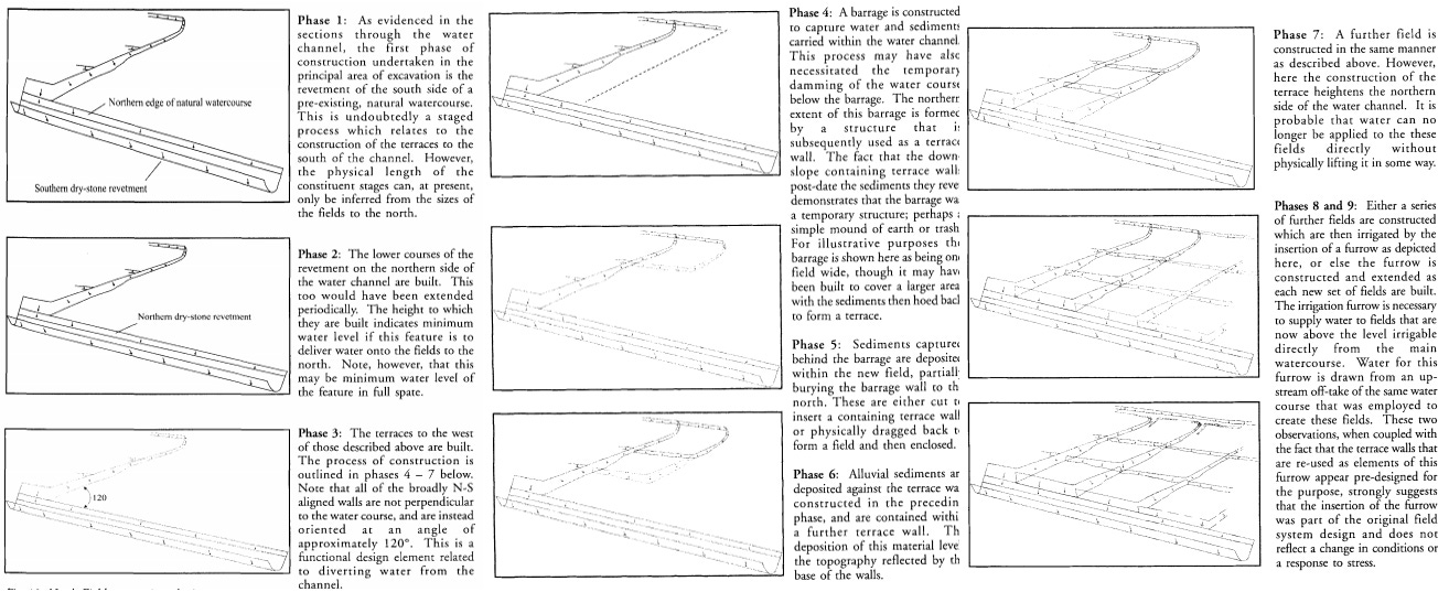The presence of deep deposits of alluvial gravels behind the dry-stone revetting structures suggests that the walls were inserted to straighten and strengthen the sides of a preexisting natural watercourse. The sequence of field construction evident from intersections where the water channel meets its irrigation furrows suggests that the stone walls were built in phases, and that the terraced area was expanded gradually.5