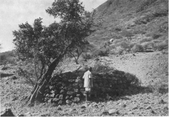 A stone cairn. showing the strongly built upper shell, which was filled with smaller stones. Image and Caption by Hamo Sassoon. (1966)