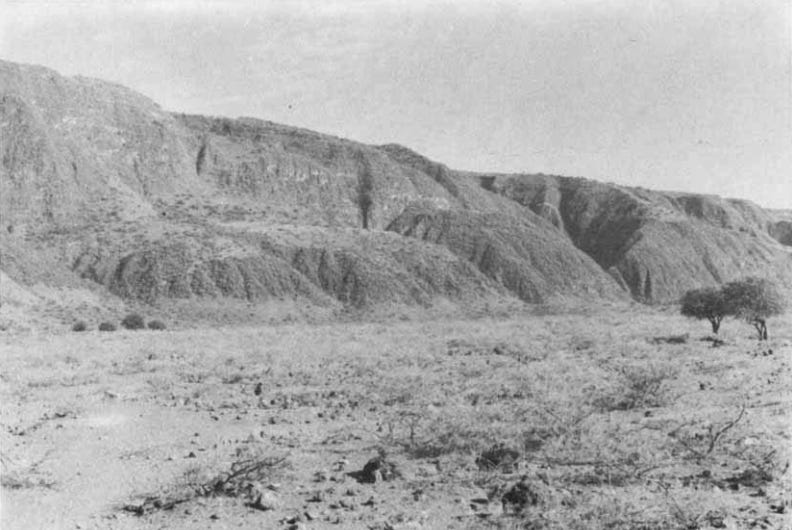 Detail of the escarpment, looking north-west from the direction of the present Engaruka village. The gorges of several dry gullies are prominent, as well as the deeper one cut by the Makuyuni river (on the right). The foreground and middle distance (between the catnera and the escarpment foot) is entirely within the area of ancient fields. Image and Captions by J. E. G. Sutton. (1978)