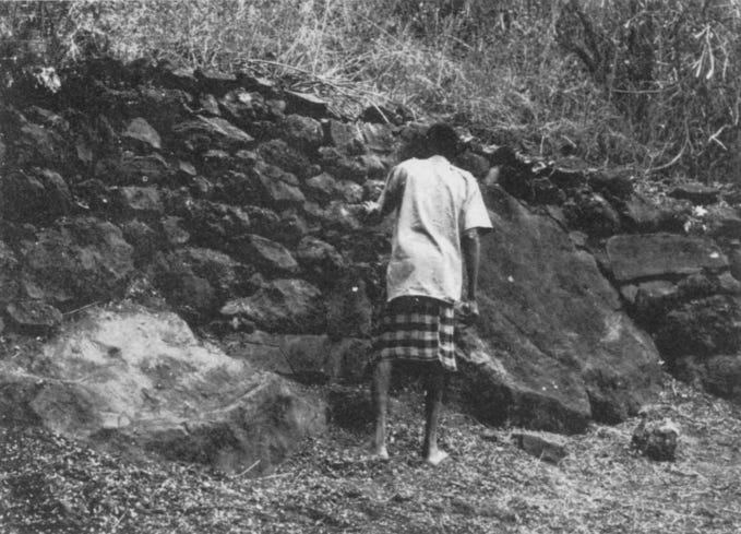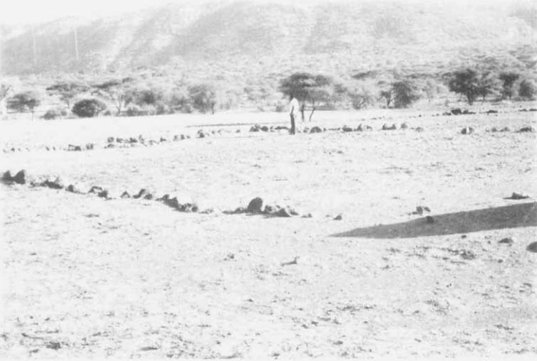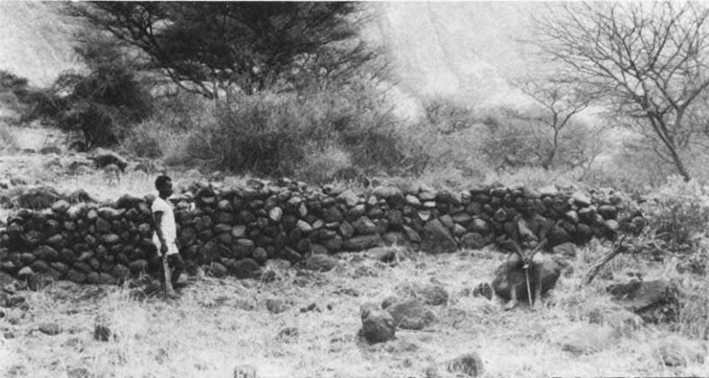 Linear wall, probably a late defensive device, in upper fields near to the south bank of the Engaruka River. Image and Captions by J. E. G. Sutton (1978)