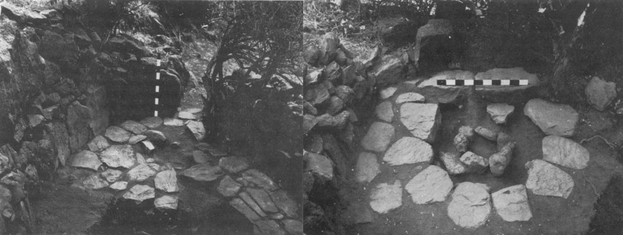 (left) The partly paved interior of one of the small hut enclosures. (right) A fireplace excavated inside the entrance of one of the small hut enclosures. images and captions by Hamo Sassoon. (1966)