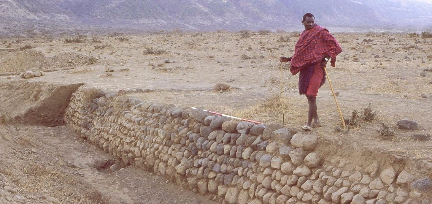section with stone revetments in situ, and check-dam wall at Engaruka, image by R. Marchant